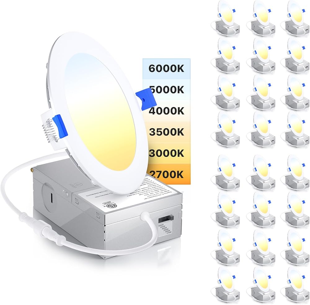 Ensenior 24 Pack 4 Inch Ultra-Thin LED Recessed Ceiling Light with Junction Box, 2700K-6000K Selectable, 9W 75W Eqv, Dimmable Can-Killer Downlight, 750LM High Brightness - ETL Certified