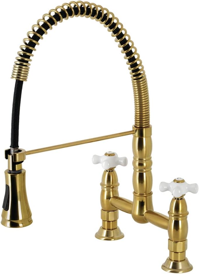 Kingston Brass GS1277PX Heritage Two-Handle Deck-Mount Pull-Down Sprayer Kitchen Faucet, Brushed Brass