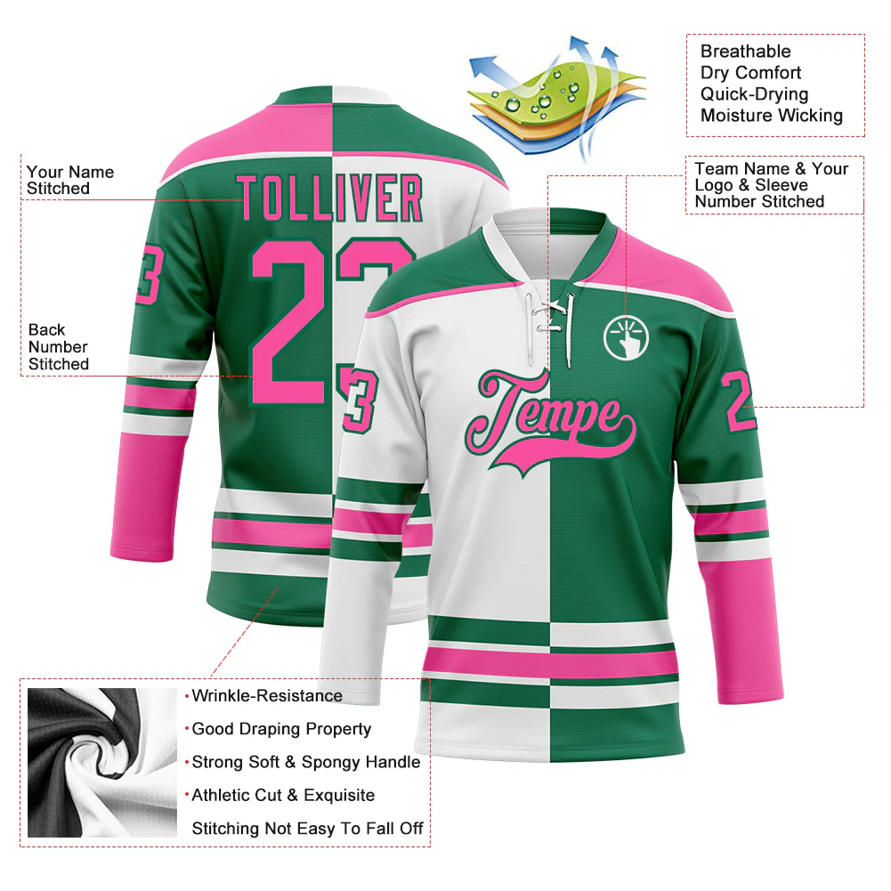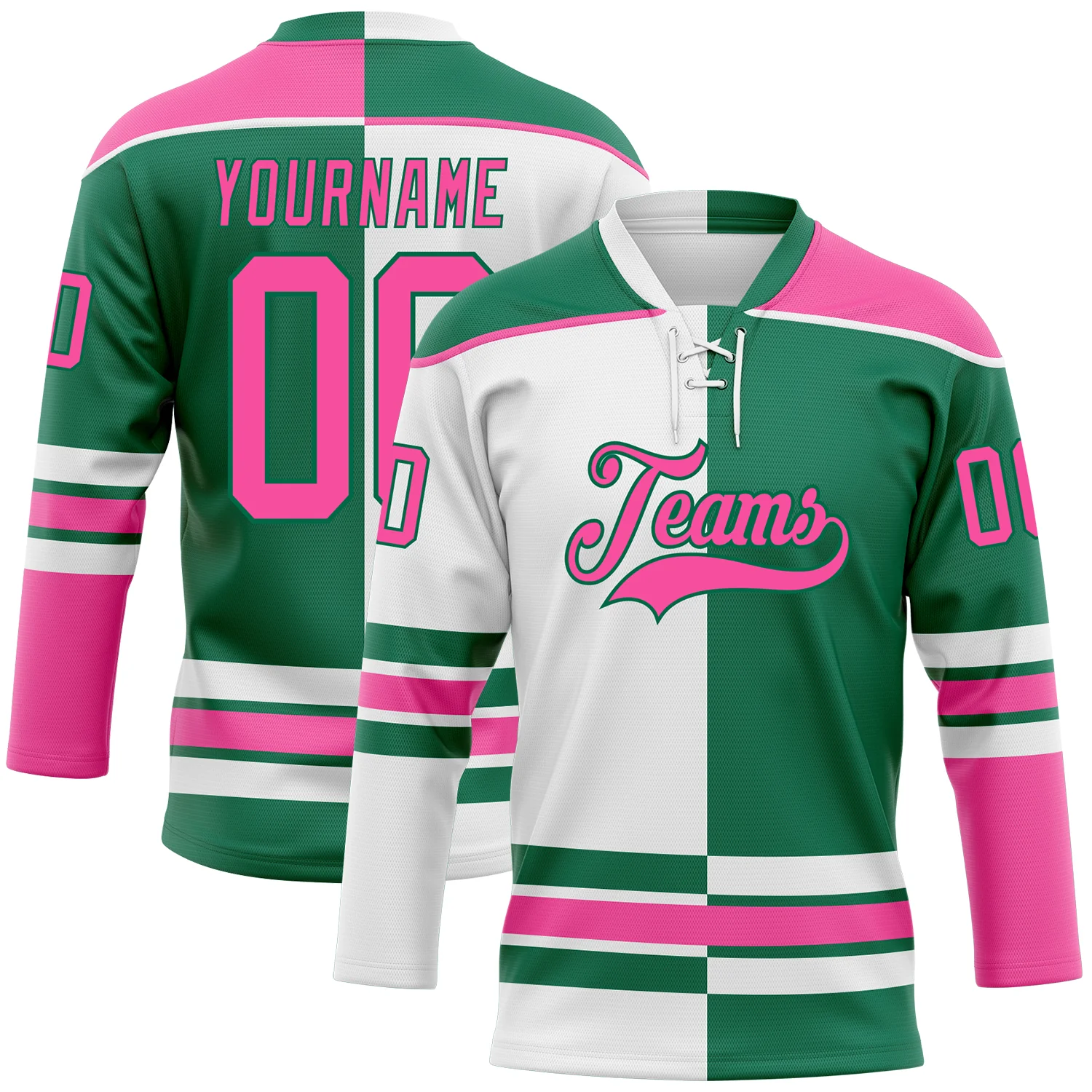Custom Green Pink-White Split Fashion Hockey Lace Neck Jersey