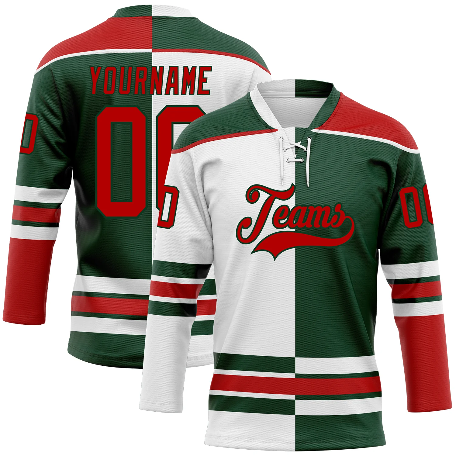 Custom Green Red-White Split Fashion Hockey Lace Neck Jersey