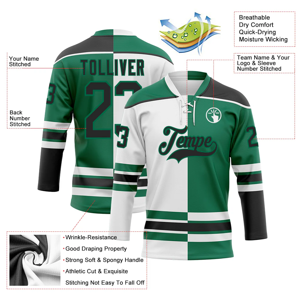 Custom Kelly Green Black-White Split Fashion Hockey Lace Neck Jersey