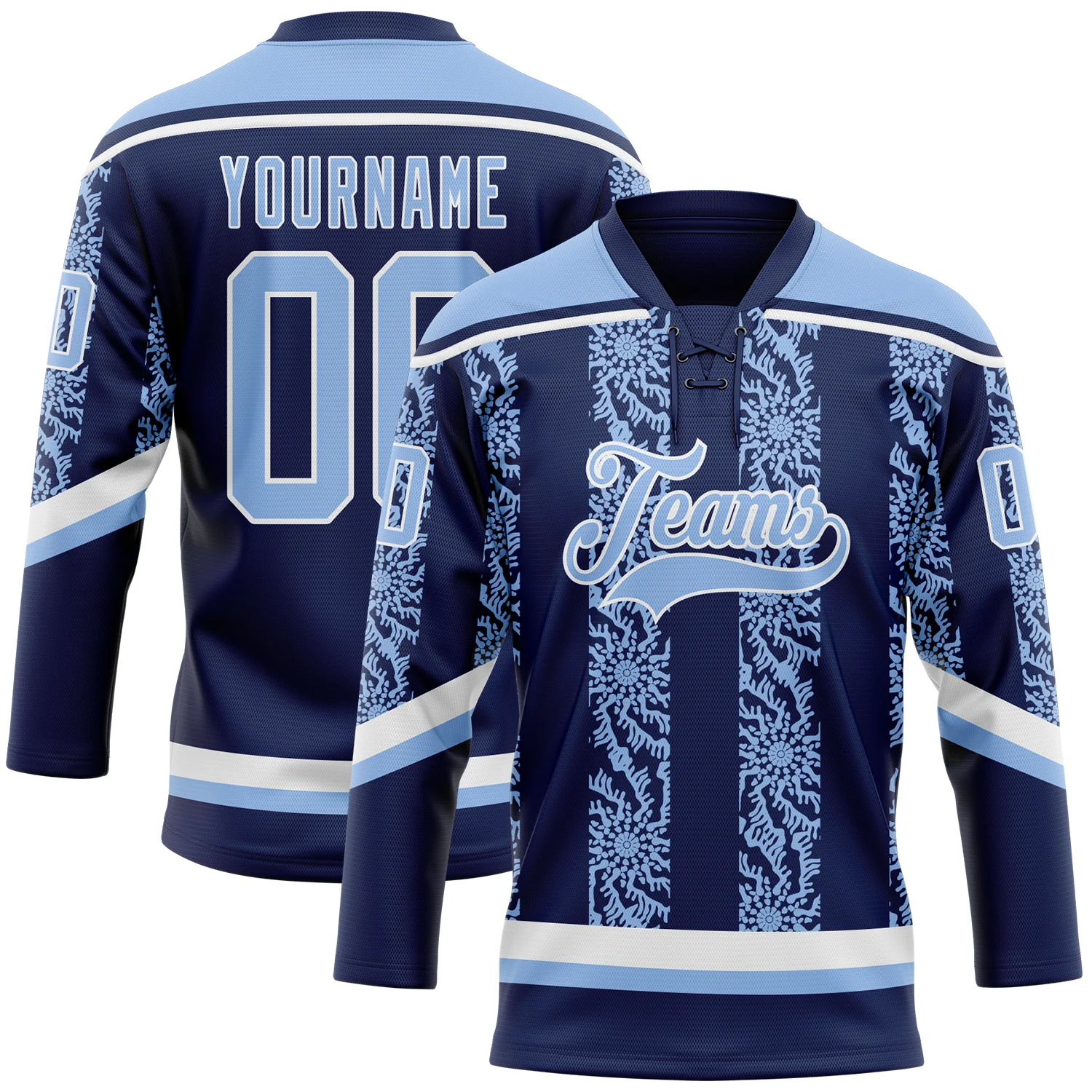 Custom Navy Light Blue-White 3D Pattern Abstract Shape Hockey Lace Neck Jersey
