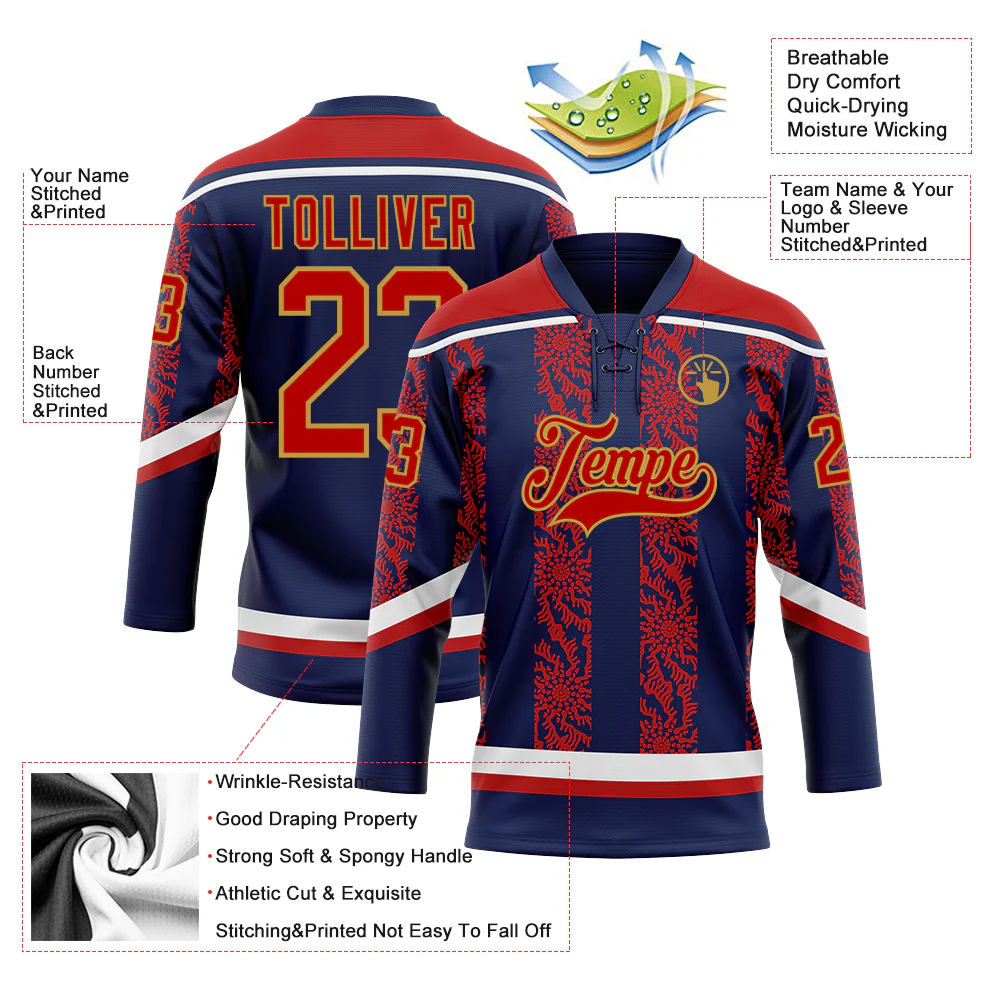 Custom Navy Red Old Gold-White 3D Pattern Abstract Shape Hockey Lace Neck Jersey