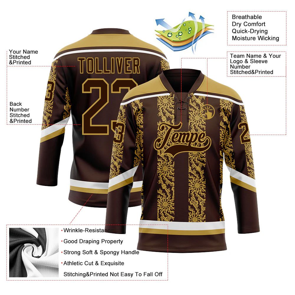 Custom Brown Old Gold-White 3D Pattern Abstract Shape Hockey Lace Neck Jersey