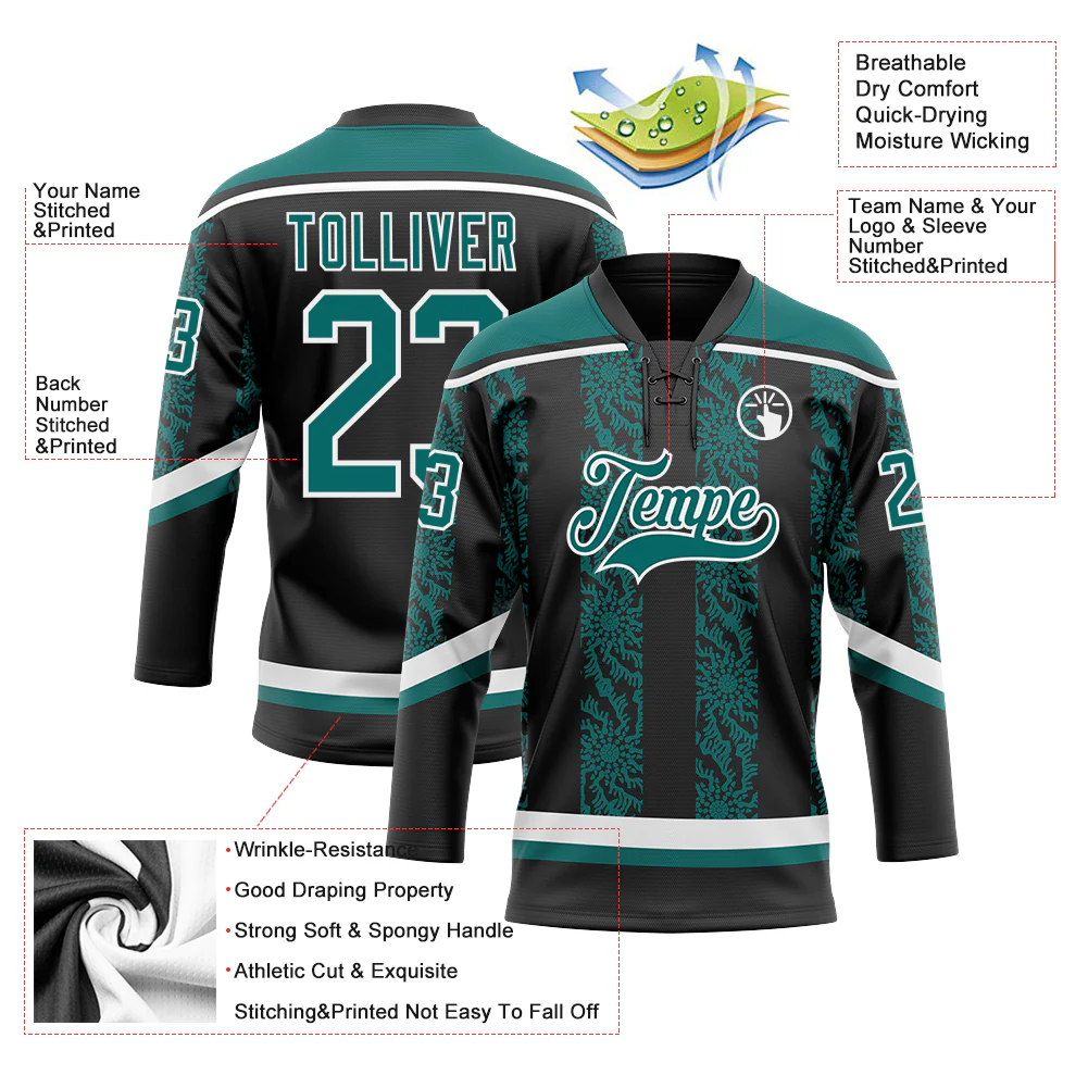 Custom Black Teal-White 3D Pattern Abstract Shape Hockey Lace Neck Jersey