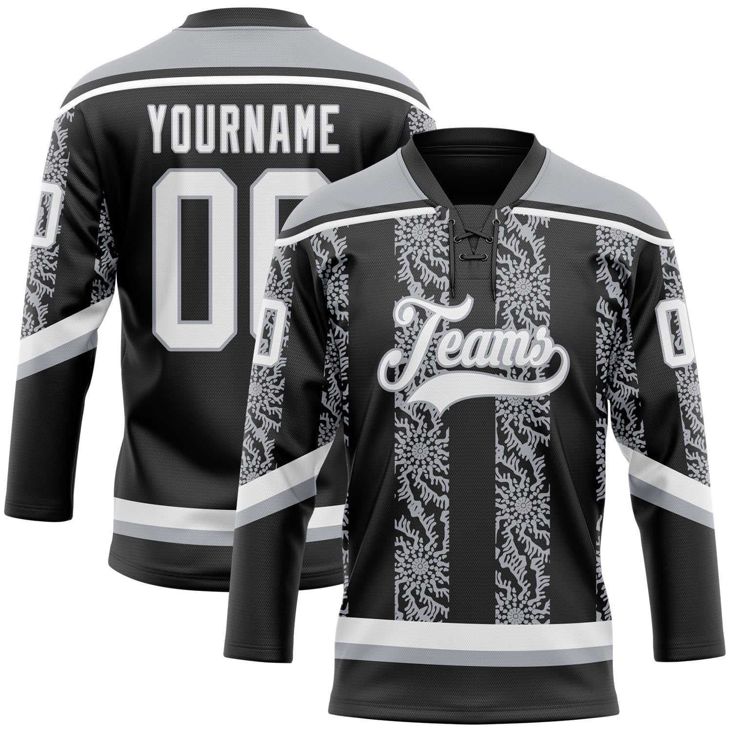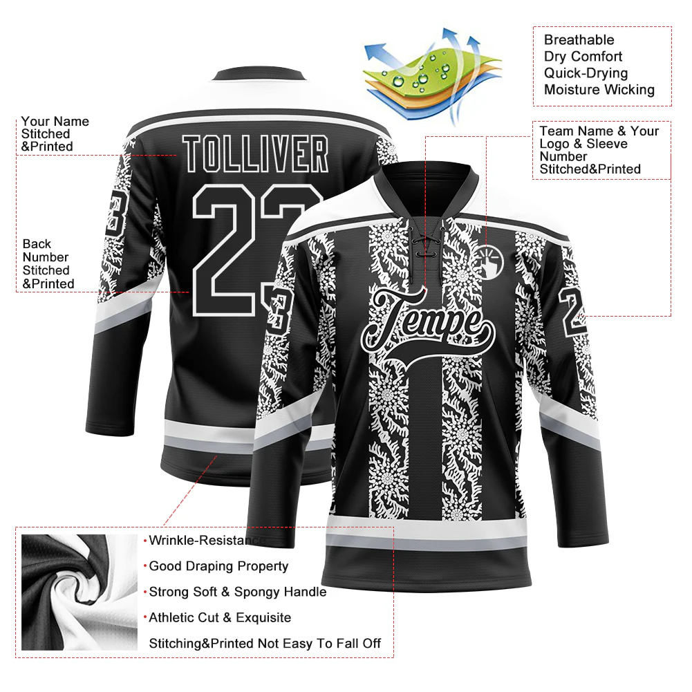 Custom Black White-Gray 3D Pattern Abstract Shape Hockey Lace Neck Jersey