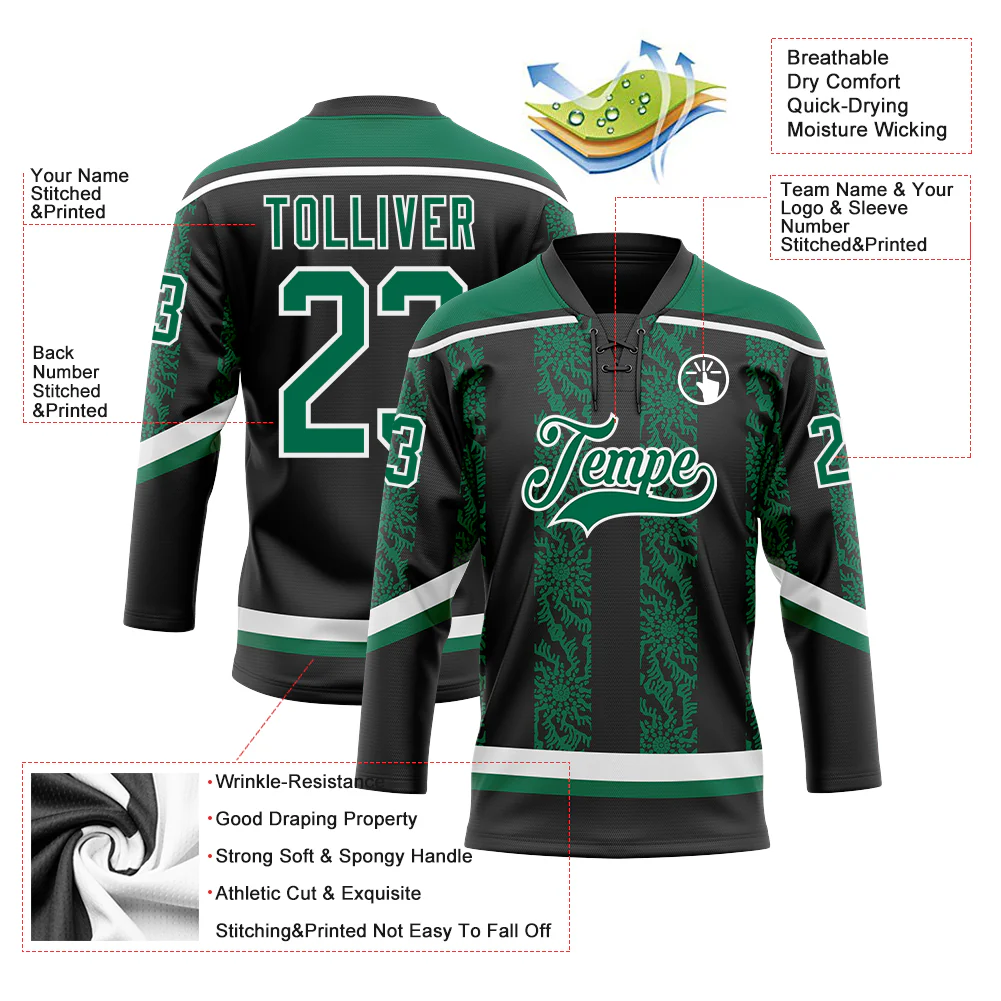 Custom Black Kelly Green-White 3D Pattern Abstract Shape Hockey Lace Neck Jersey