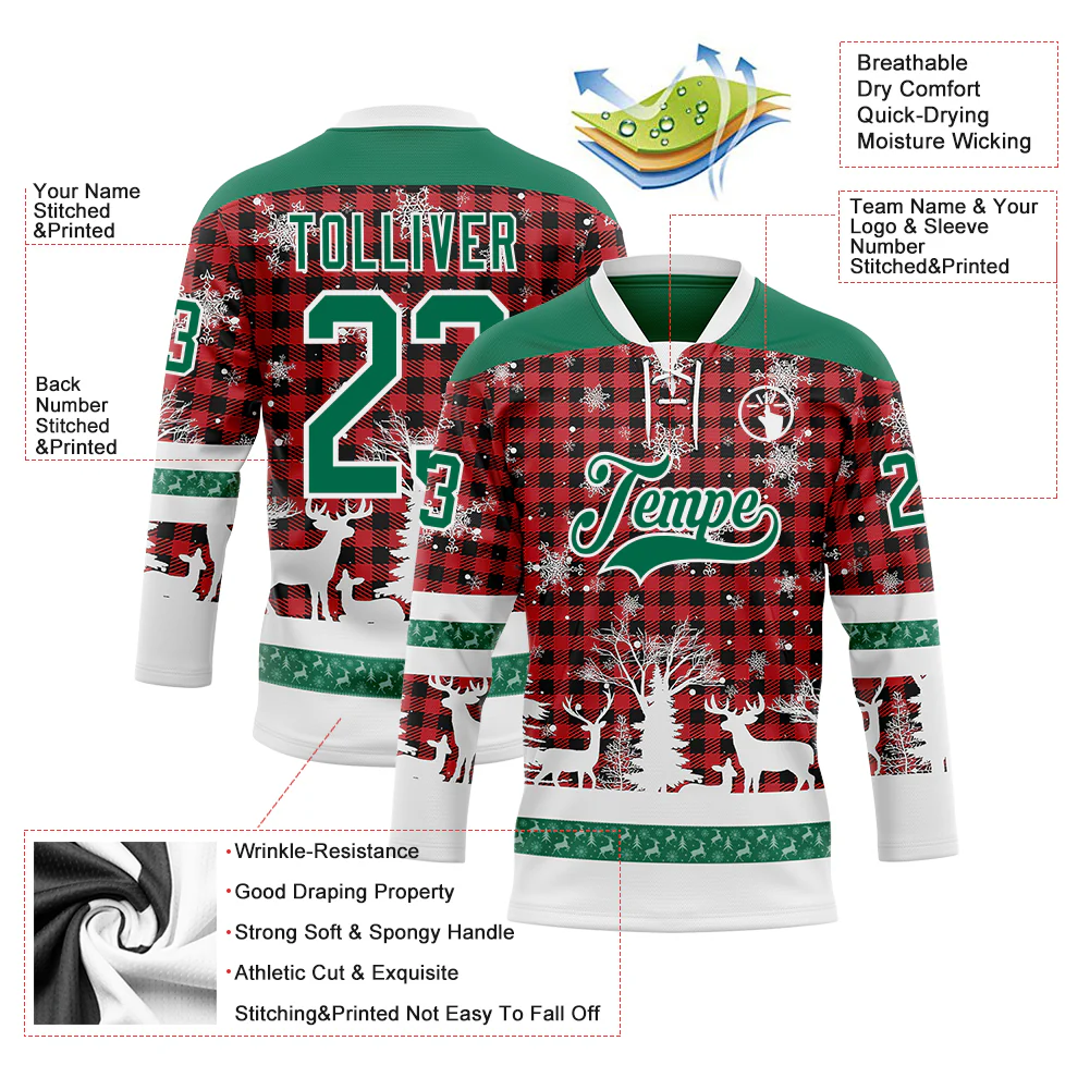 Custom Red Kelly Green-White 3D Christmas Plaid Hockey Lace Neck Jersey