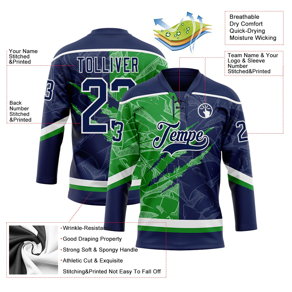 Custom Navy Grass Green-White 3D Pattern Gradient Fashion Scratch Hockey Lace Neck Jersey