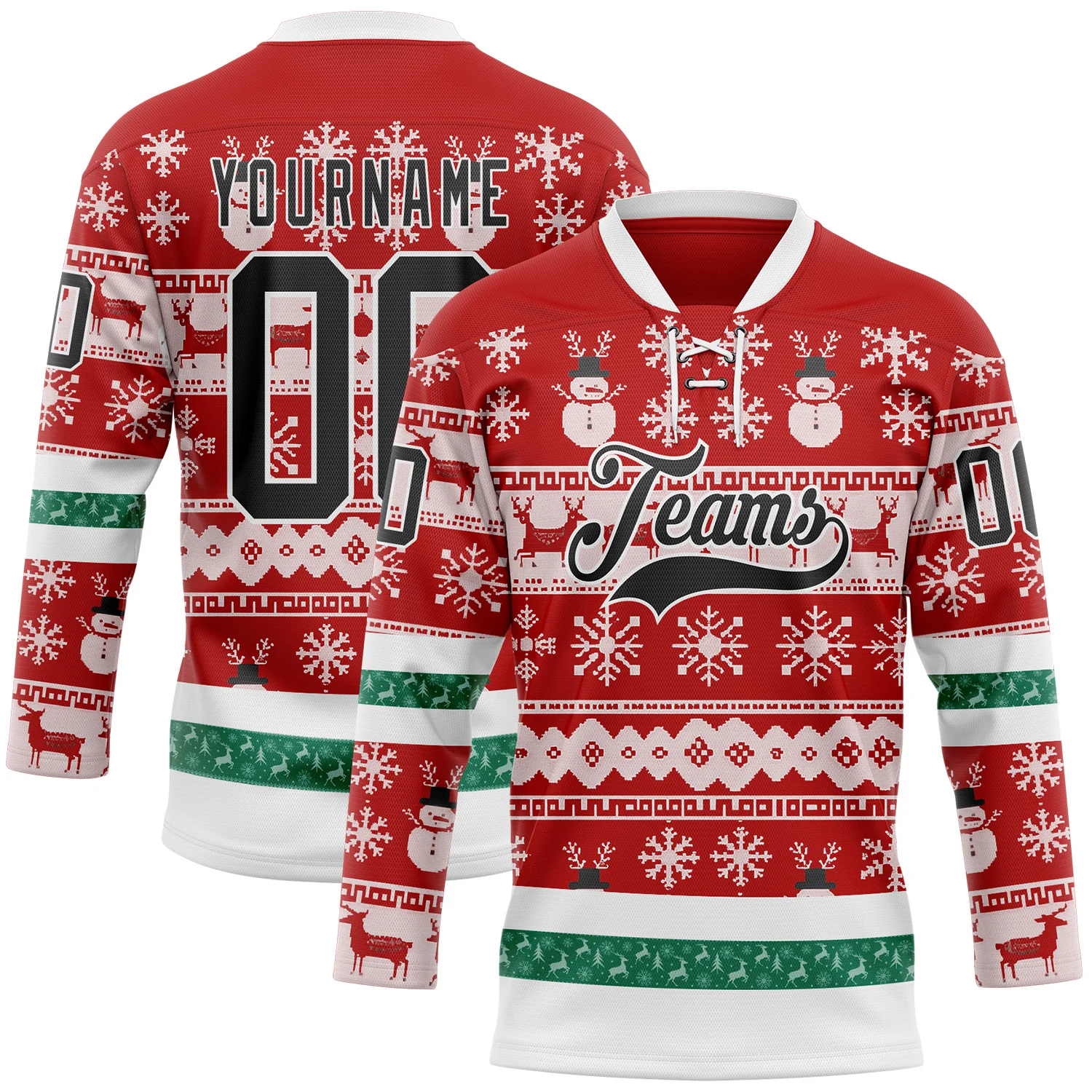 Custom Red Black-White 3D Christmas Ugly Sweater Hockey Lace Neck Jersey