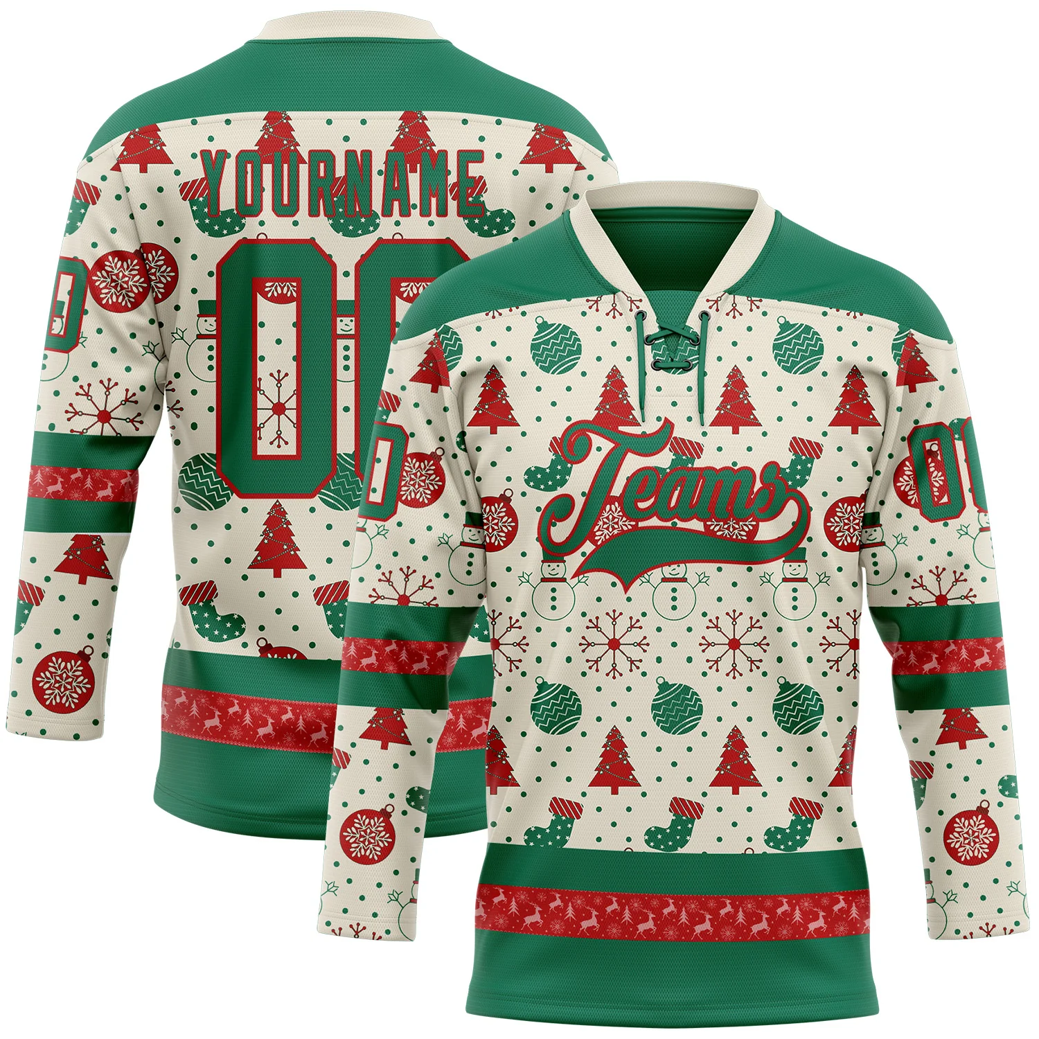 Custom Cream Kelly Green-Red 3D Christmas Hockey Lace Neck Jersey