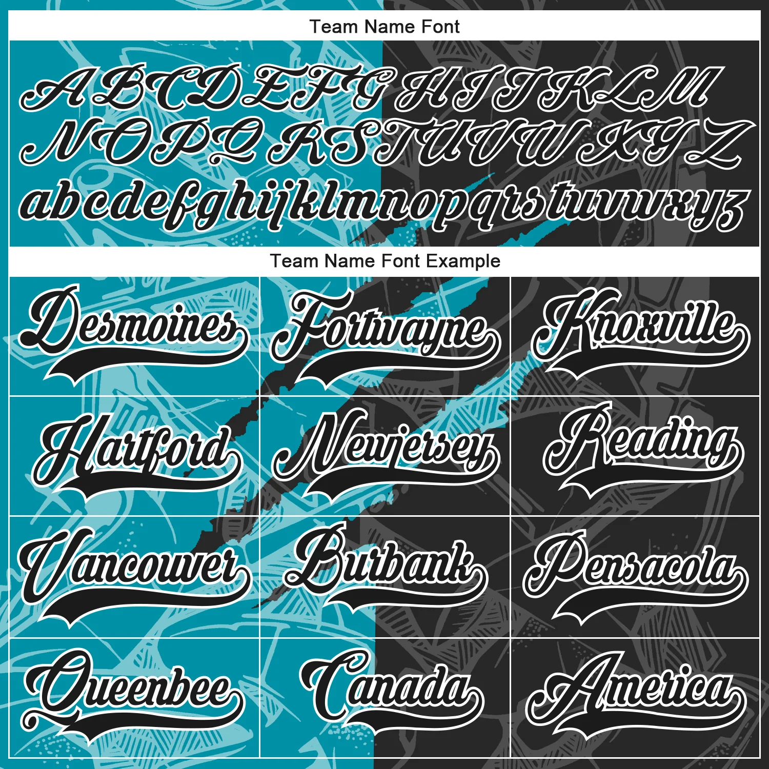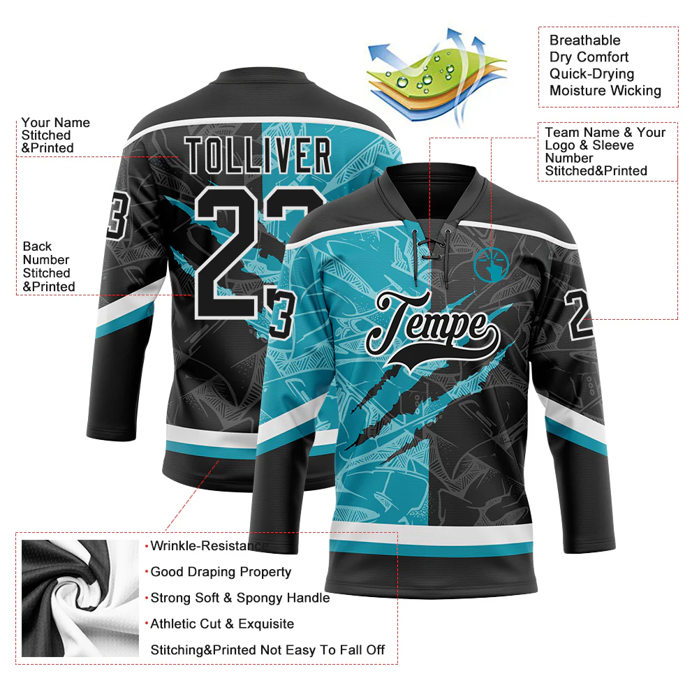 Custom Black Teal-White 3D Pattern Gradient Fashion Scratch Hockey Lace Neck Jersey