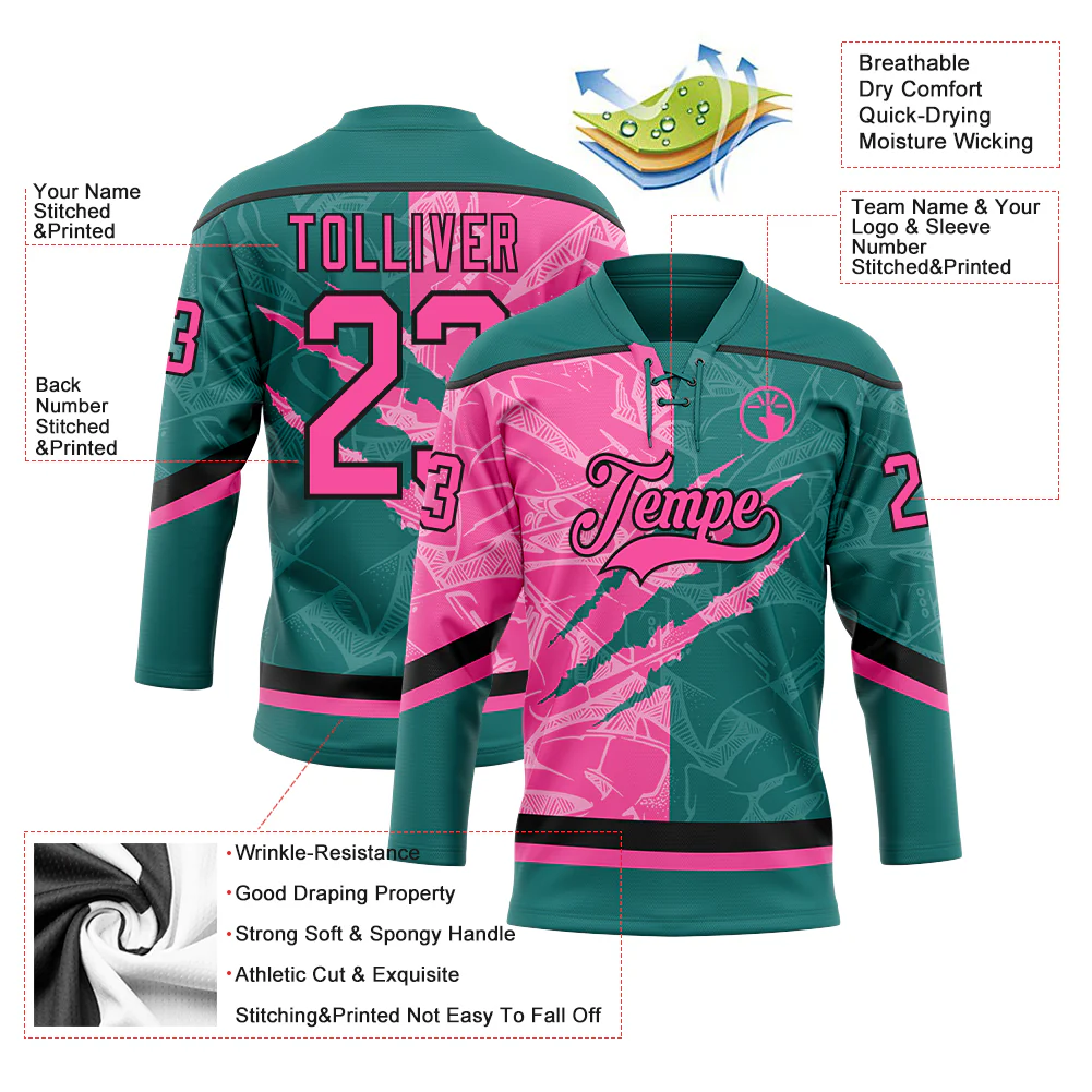 Custom Teal Pink-Black 3D Pattern Gradient Fashion Scratch Hockey Lace Neck Jersey