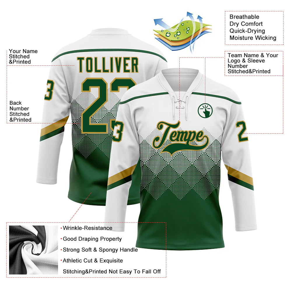 Custom White Green-Old Gold 3D Pattern Gradient Square Shapes Hockey Lace Neck Jersey