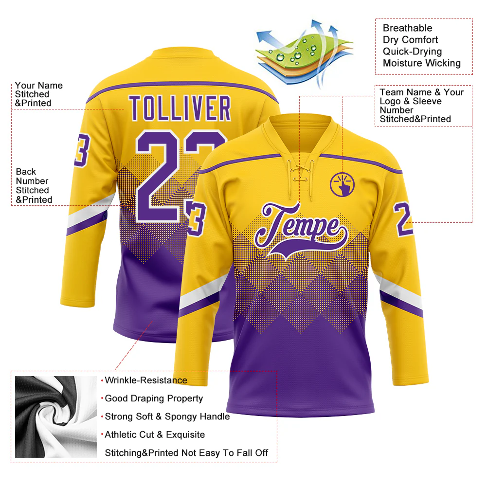Custom Yellow Purple-White 3D Pattern Gradient Square Shapes Hockey Lace Neck Jersey