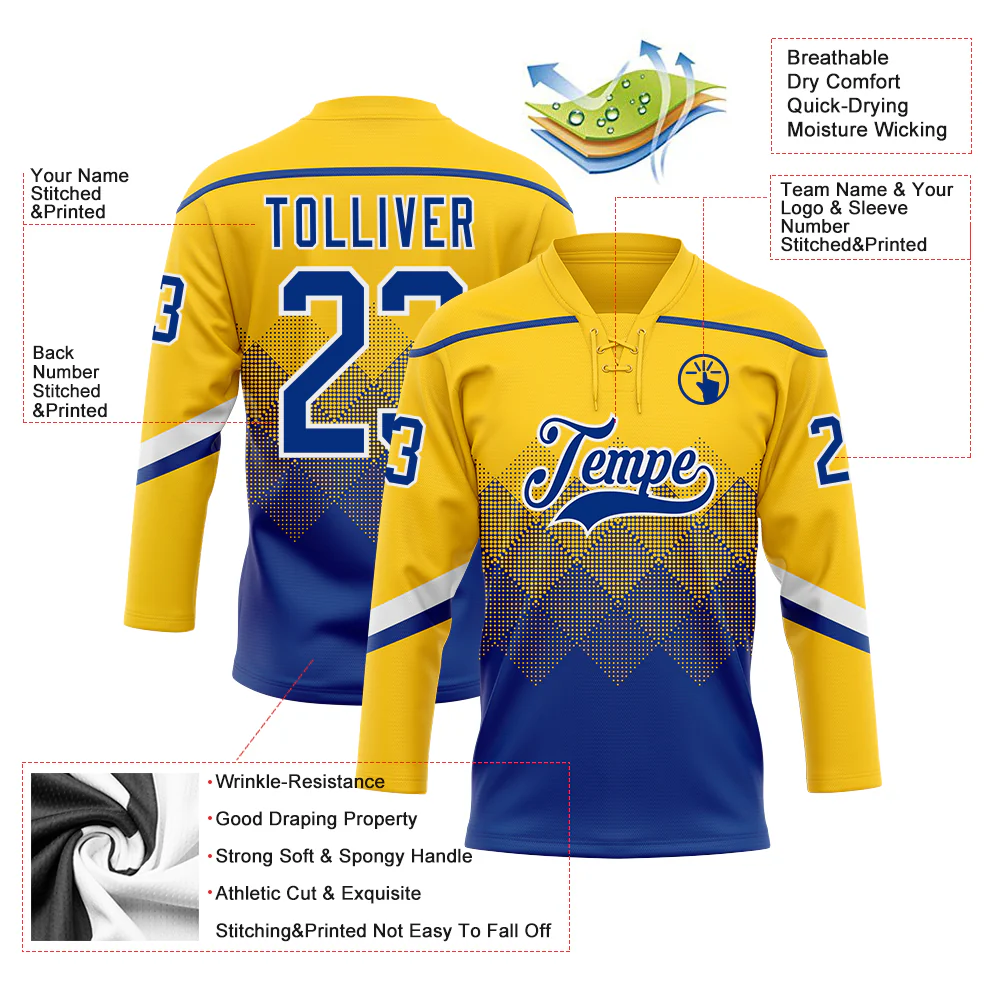 Custom Yellow Royal-White 3D Pattern Gradient Square Shapes Hockey Lace Neck Jersey