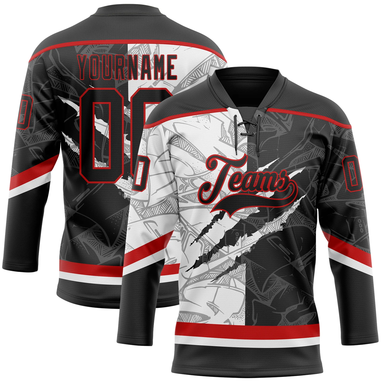Custom Black White-Red 3D Pattern Gradient Fashion Scratch Hockey Lace Neck Jersey