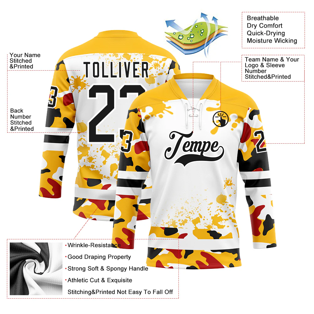Custom Camo Black Gold-White Splash Hockey Lace Neck Jersey