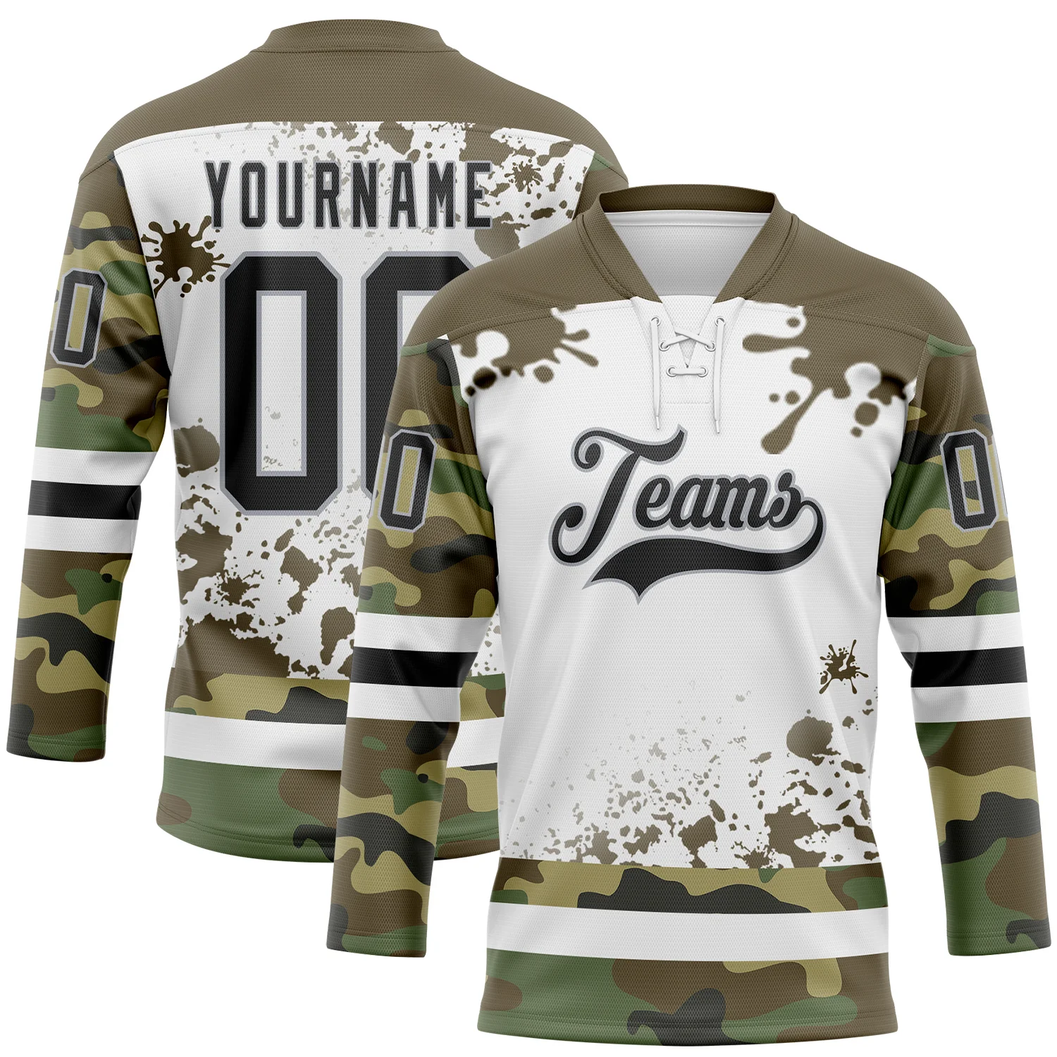 Custom Camo Black Olive Gray-White Splash Hockey Lace Neck Jersey