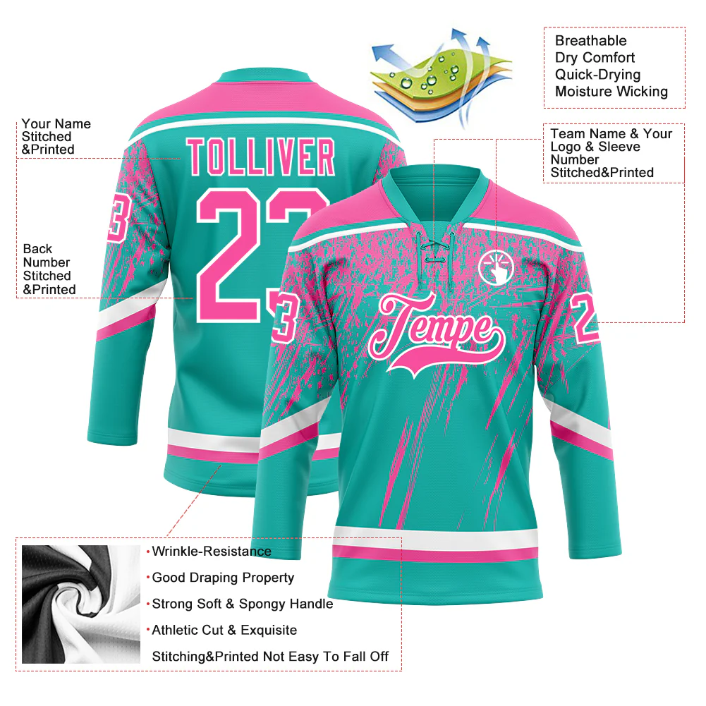 Custom Aqua Pink-White 3D Splash Hockey Lace Neck Jersey