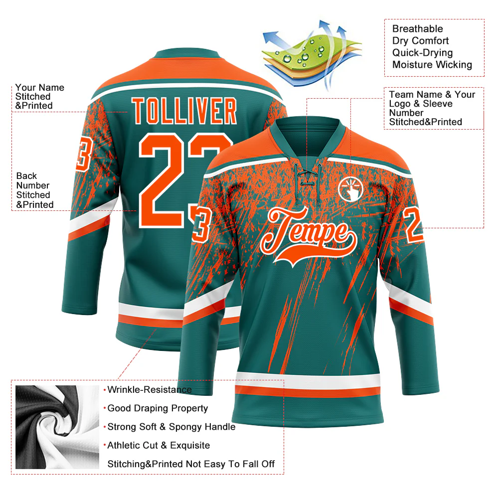 Custom Teal Orange-White 3D Splash Hockey Lace Neck Jersey