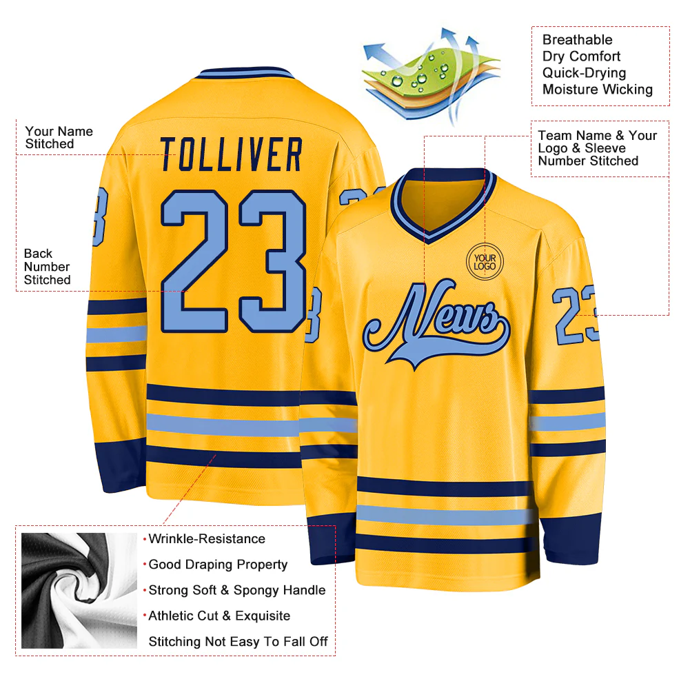 Custom Gold Light Blue-Navy Hockey Jersey