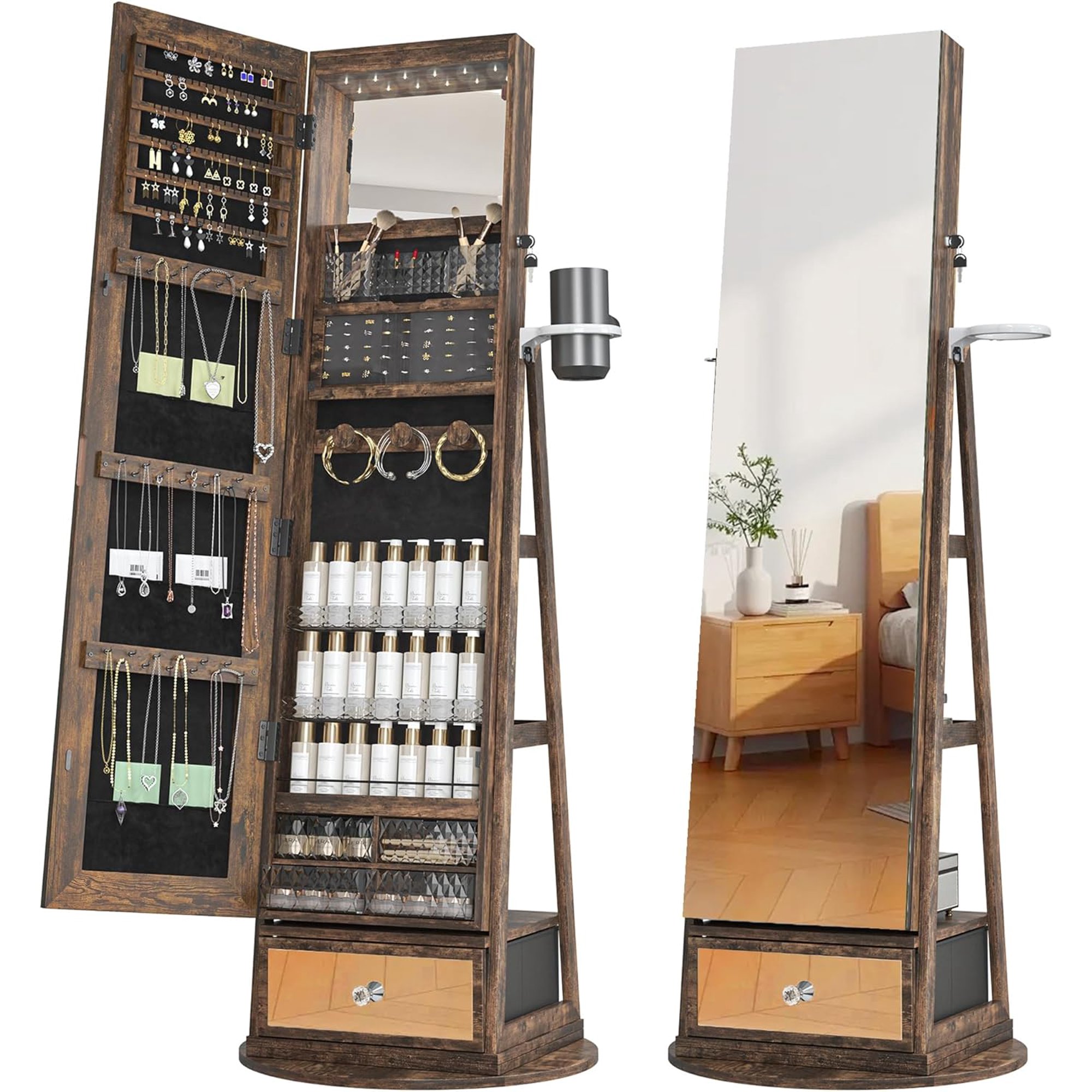 Jewelry Cabinet with Full-Length Mirror, 360 Rotating Jewelry Accessories OrganizerLarge Storage CapacityRings, Earrings, Necklaces, Bracelets, Perfumes