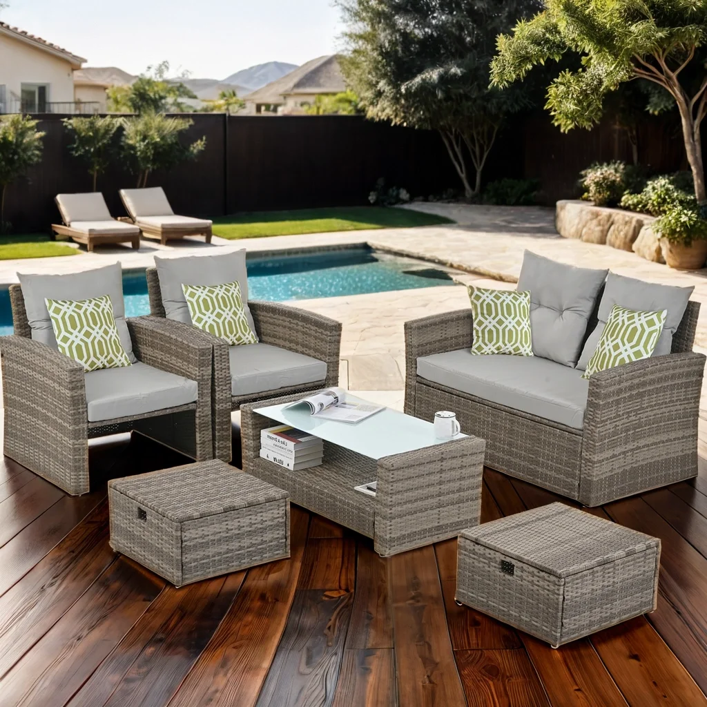 Highsound 4 Piece Patio Furniture Sets, Wicker Outdoor Conversation Set with 2 Ottomans & Coffee Table, Rattan Sofa Chair Set, Gray
