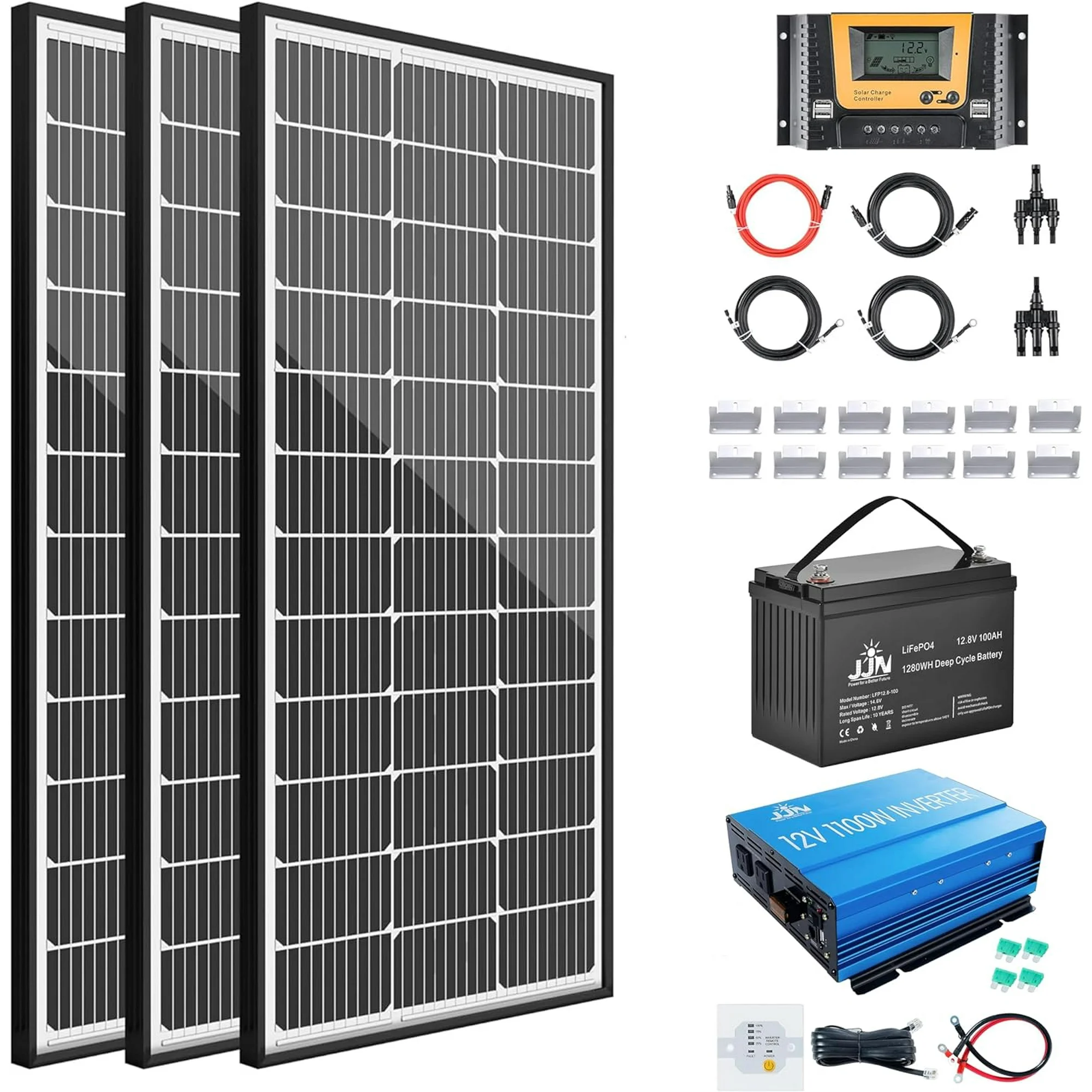 JJN 300W 12V Solar Panel Kit for RV, Trailer, Camper, Marine, Off Grid| 3pcs 100W Solar Panel, 40A PWM Solar Charge Controller,100Ah Lithium Battery + 1100W Power Inverter