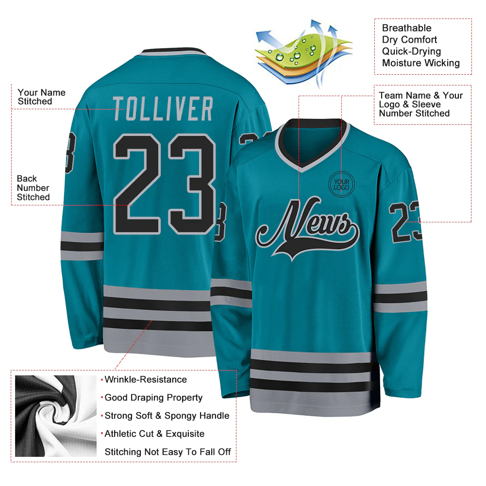 Custom Teal Black-Gray Hockey Jersey