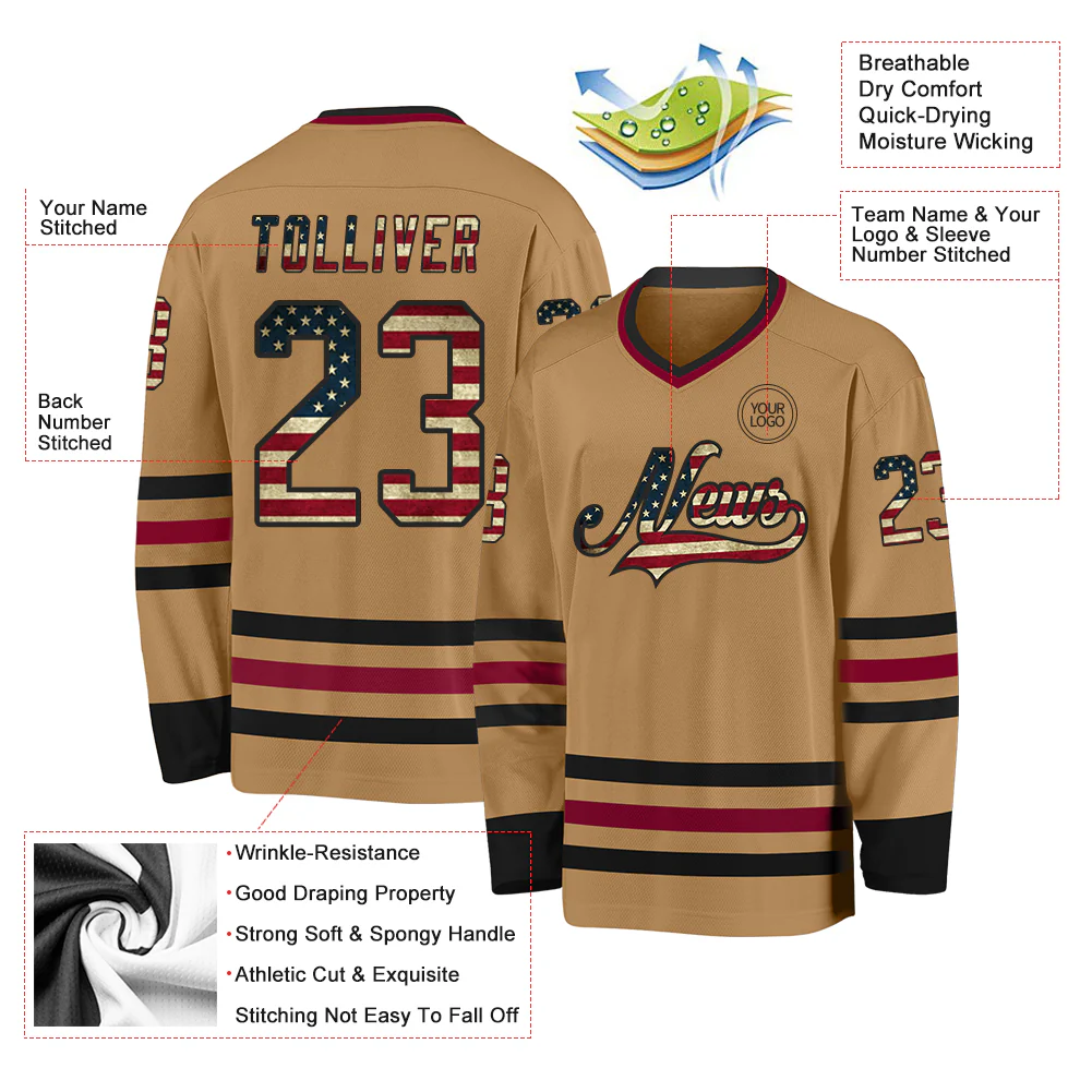Custom Old Gold Vintage USA Flag Black-Maroon Hockey Jersey