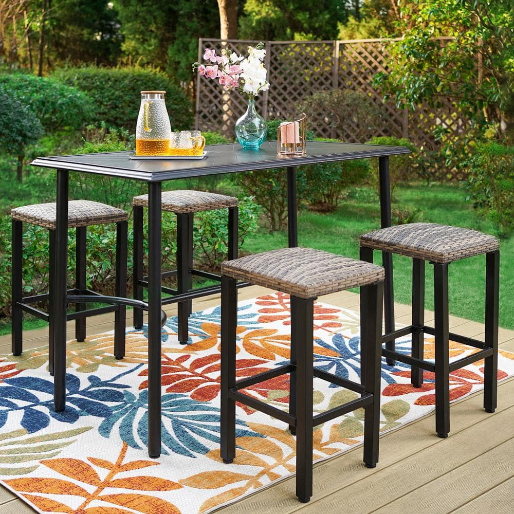 PHI VILLA 5-Piece Metal Outdoor Patio Bar Height Dining Set with Rectangle Table and Rattan Wicker Outdoor Bar Stool