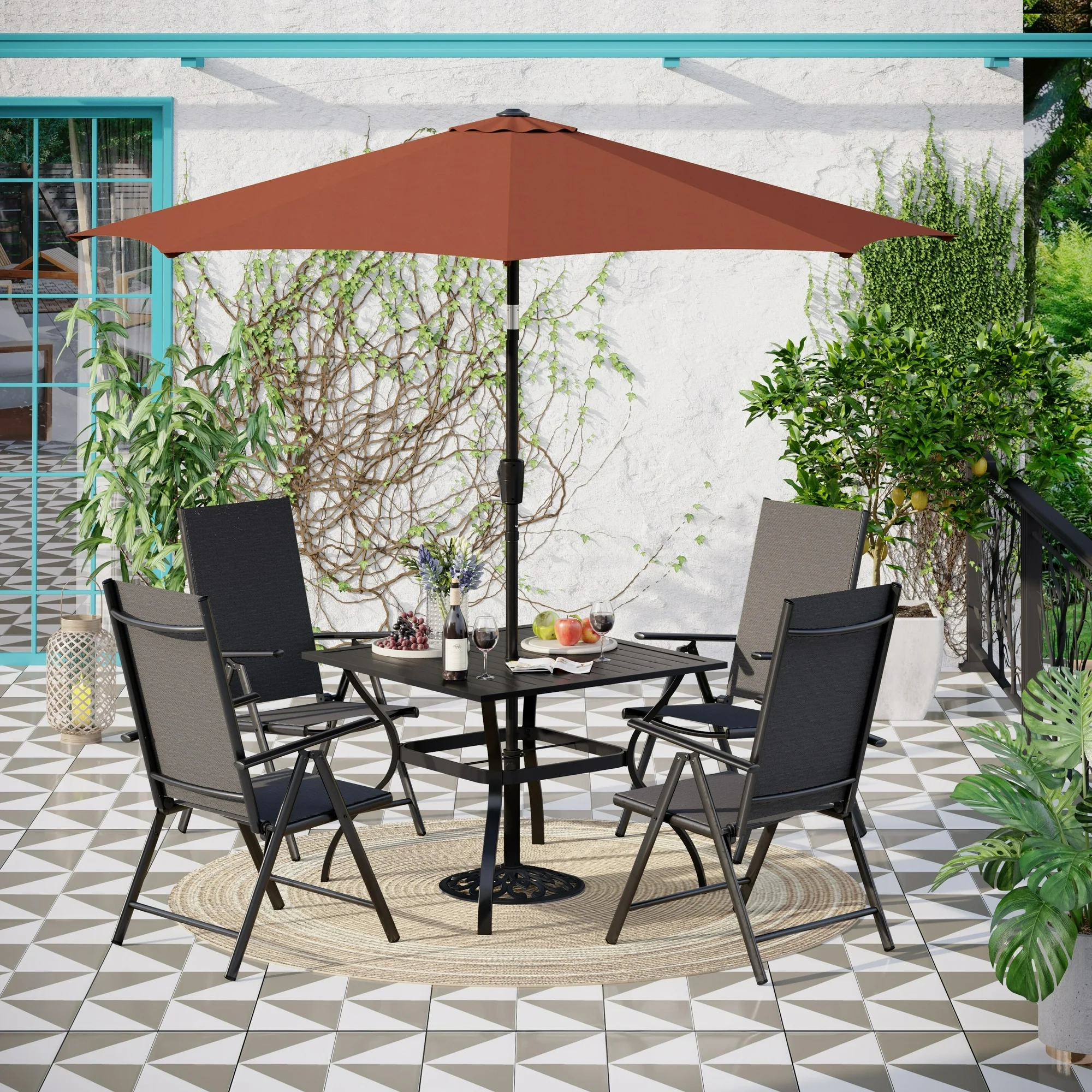 PHI VILLA 6-piece Patio Dining Set, 1 Square Metal table, 4 Adjustable Folding Chairs and 9ft Umbrella Red