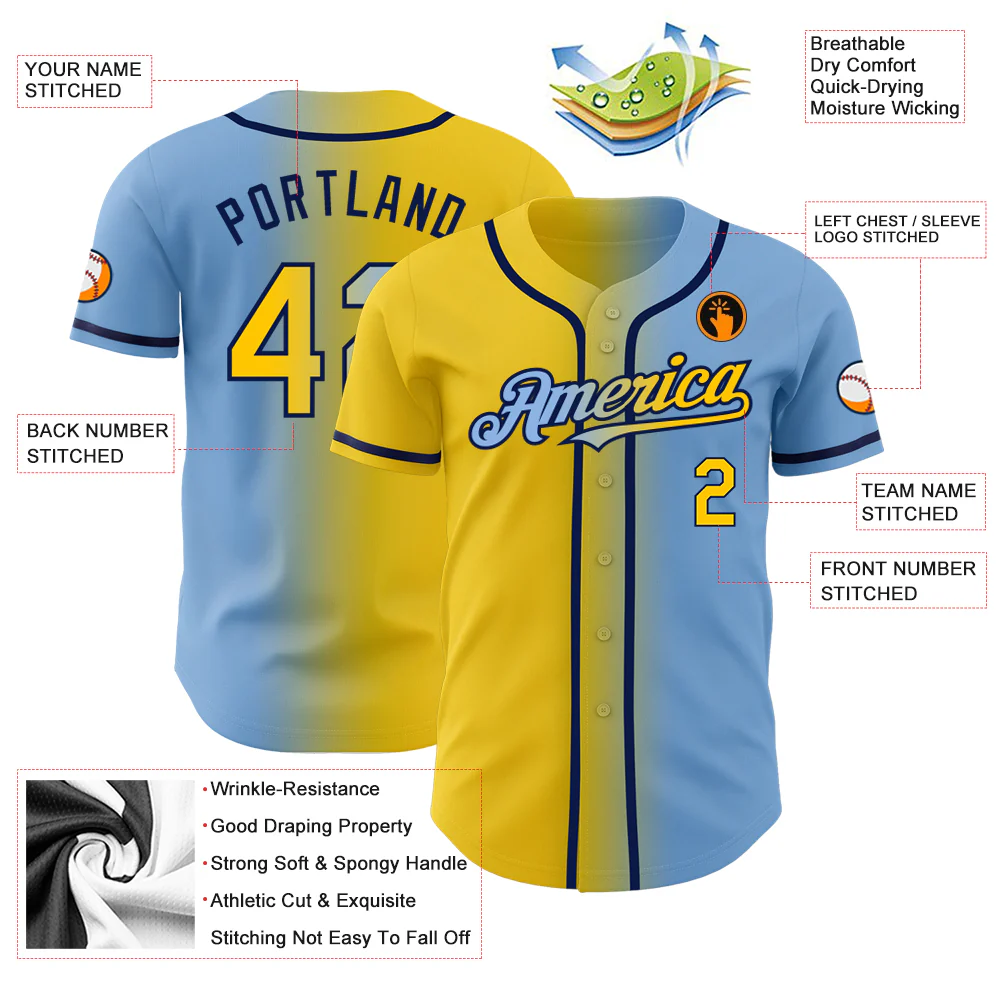 Custom Light Blue Yellow-Navy Authentic Gradient Fashion Baseball Jersey