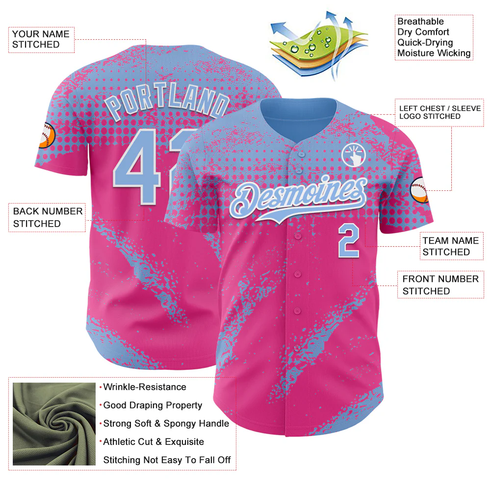 Custom Light Blue Pink-White 3D Pattern Design Splash Grunge Fragment Authentic Baseball Jersey
