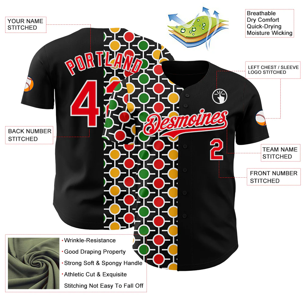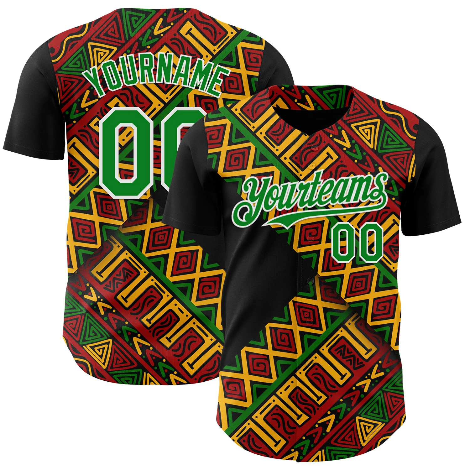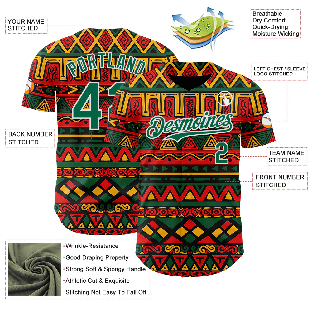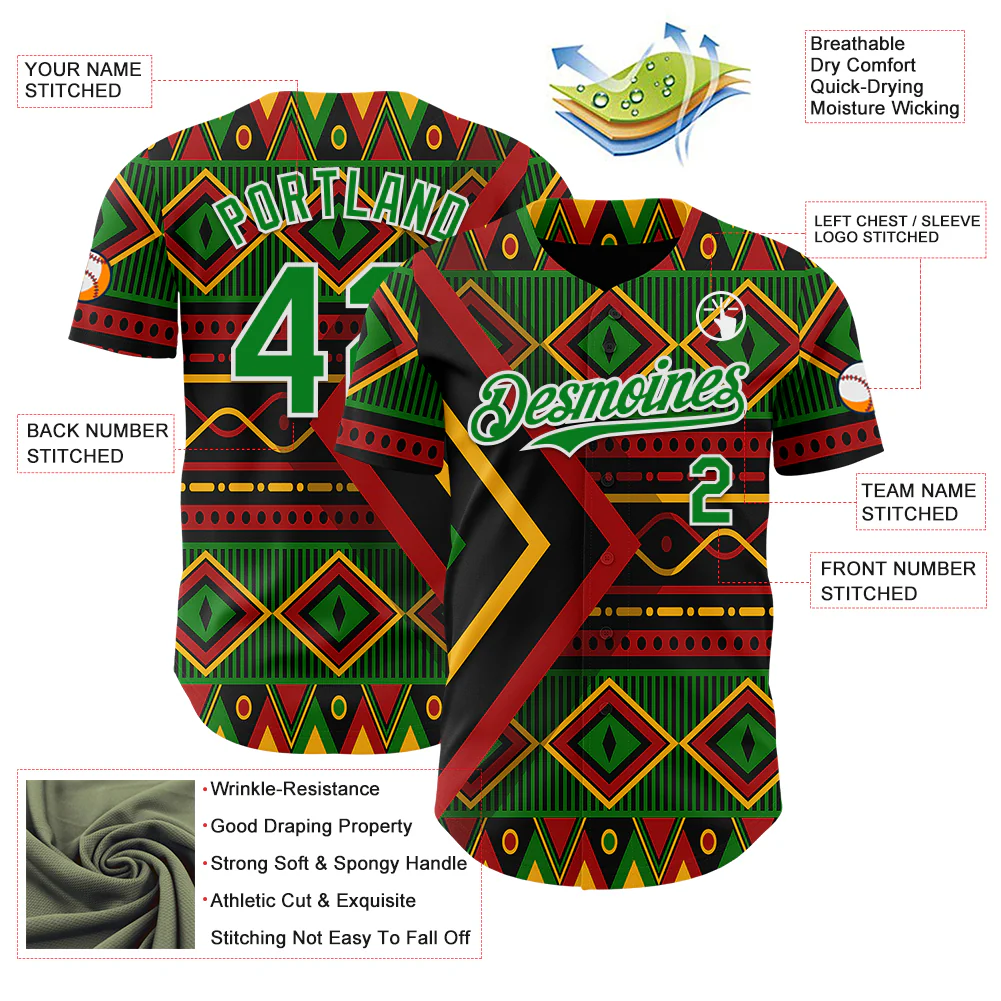 Custom Black Kelly Green Red Yellow-White 3D Pattern Design Black History Month African Ethnicity Style Abstract Geometric Authentic Baseball Jersey