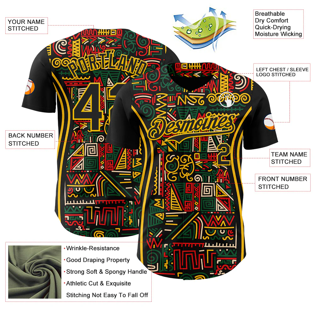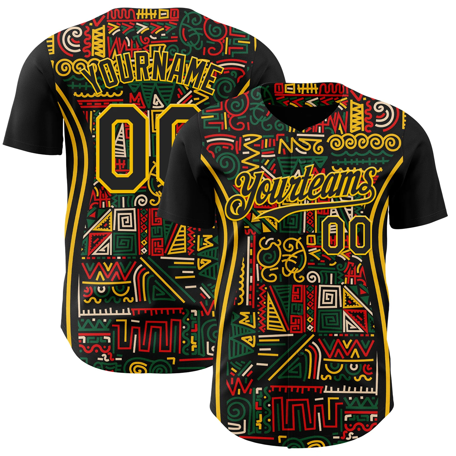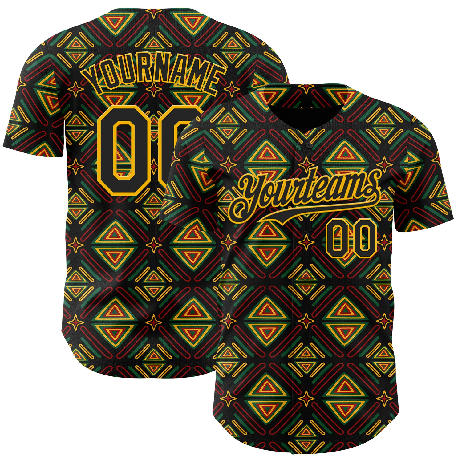 Custom Black Gold Green-Red 3D Pattern Design Black History Month African Ethnicity Style Abstract Geometric Authentic Baseball Jersey