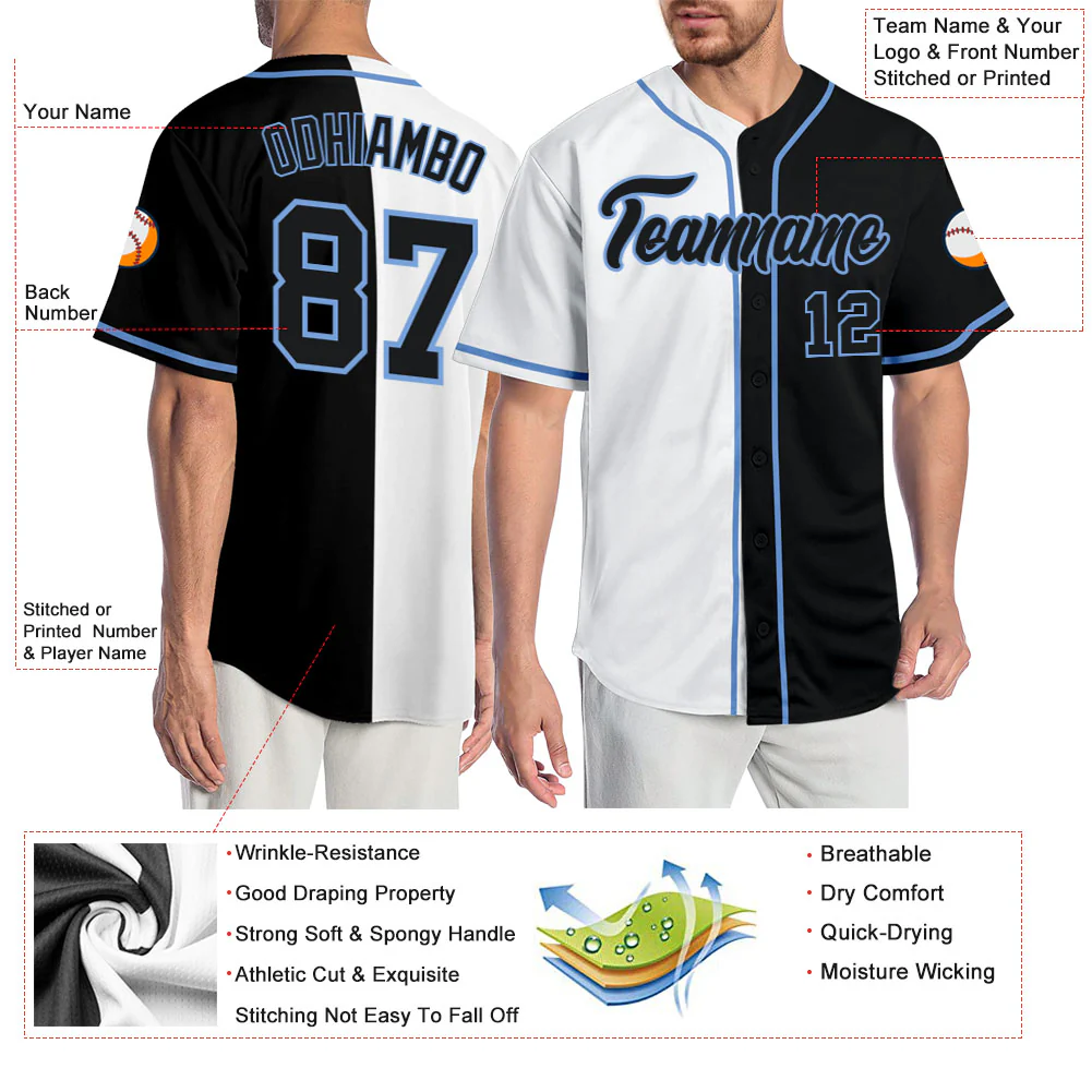 Custom White Black-Light Blue Authentic Split Fashion Baseball Jersey