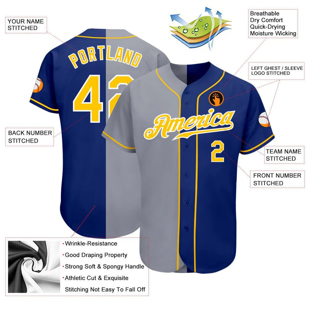 Custom Royal Gold-Gray Authentic Split Fashion Baseball Jersey