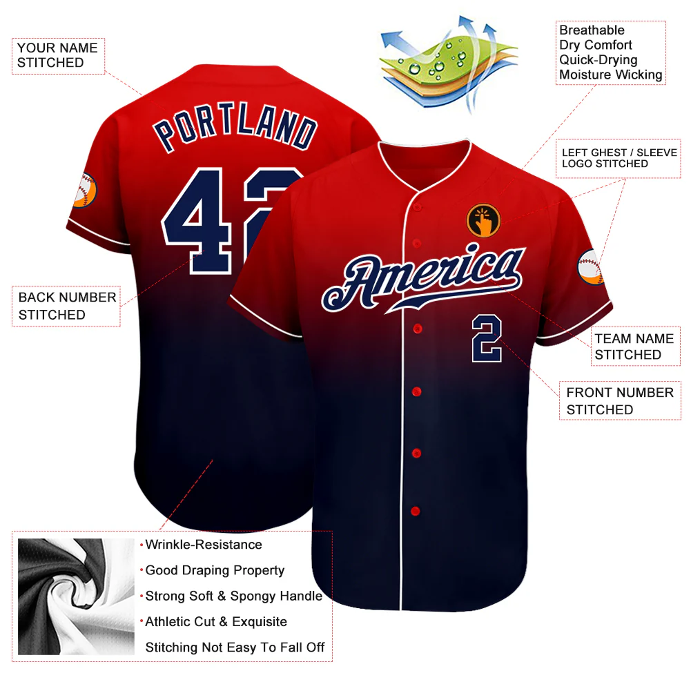 Custom Red Navy-White Authentic Fade Fashion Baseball Jersey