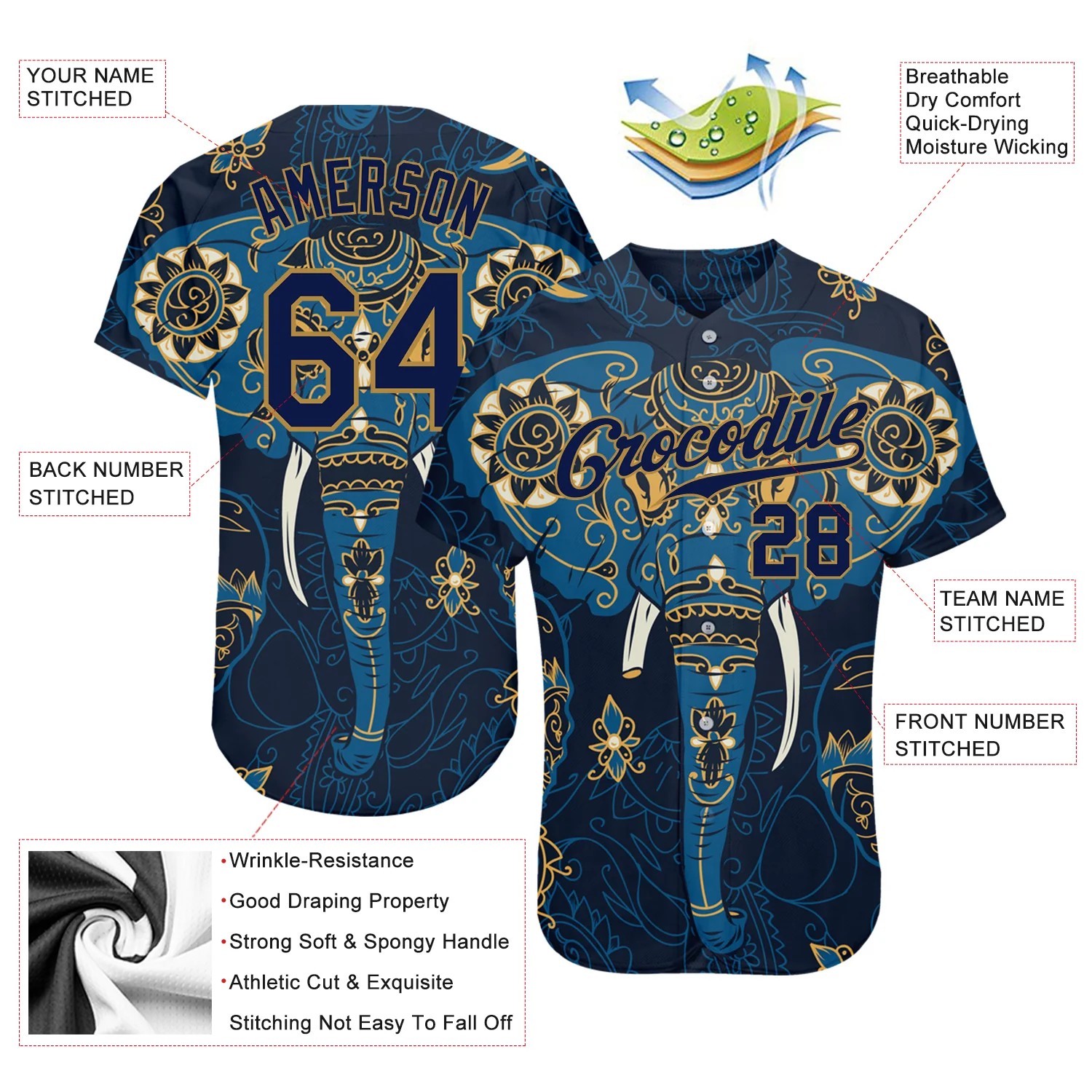 Custom Navy Navy-Old Gold 3D Pattern Design Elephant Authentic Baseball Jersey
