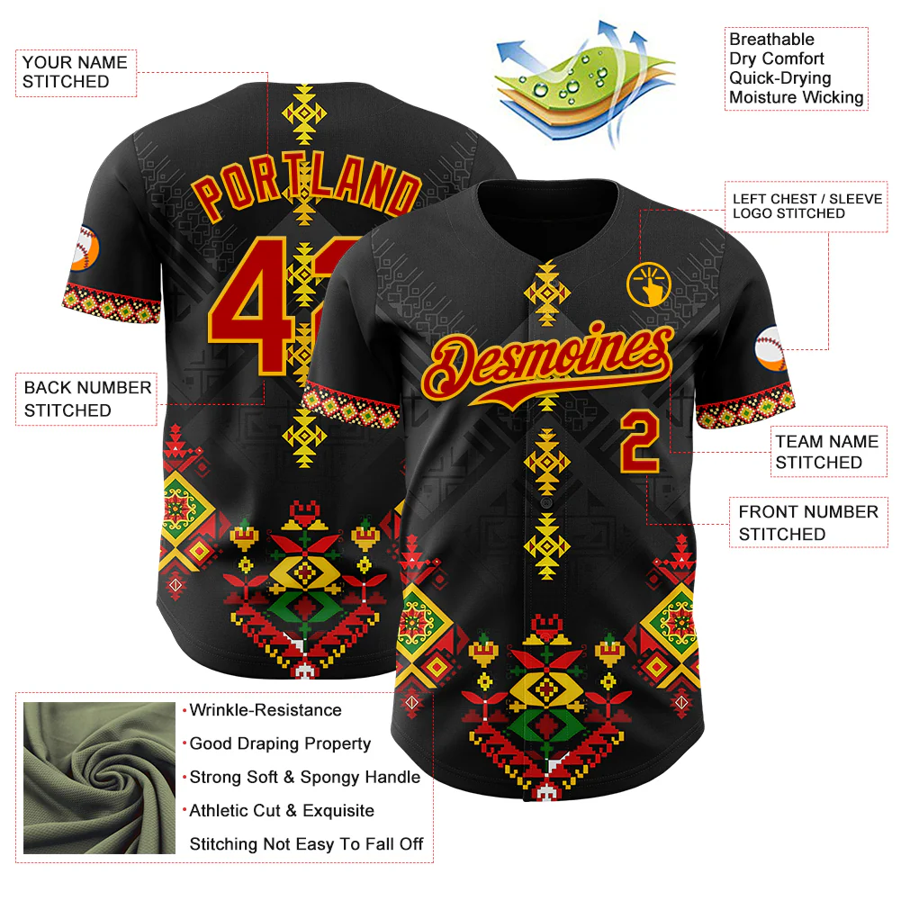 Custom Black Red Gold-Green 3D Pattern Design Black History Month Africa Tribal Authentic Baseball Jersey