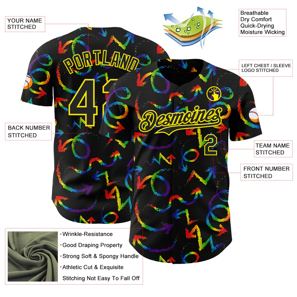 Custom Black Light Yellow Valentine's Day Arrow Pride Month Love Is Love Authentic Baseball Jersey
