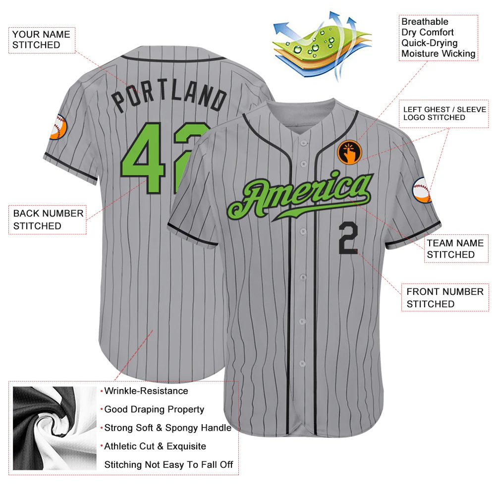 Custom Gray Black Pinstripe Neon Green-Black Authentic Baseball Jersey