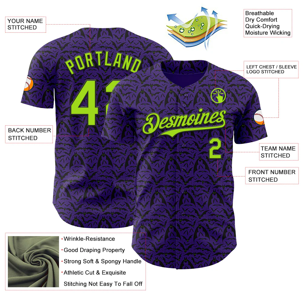 Custom Purple Neon Green-Black 3D Halloween Bat Party Costume Ideas Authentic Baseball Jersey