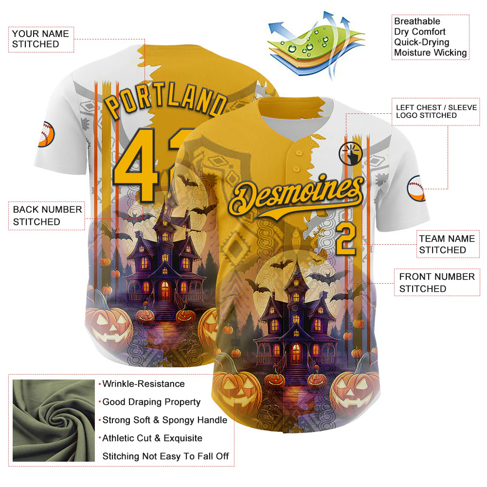 Custom White Black-Gold 3D Halloween Spooky Bat Stripe Authentic Baseball Jersey