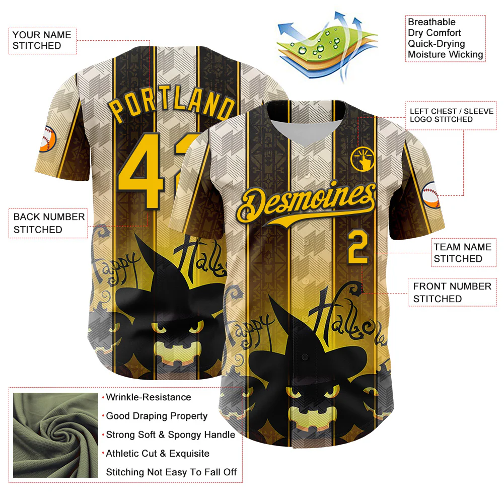 Custom Yellow Black 3D Halloween Spooky Pumpkin Authentic Baseball Jersey