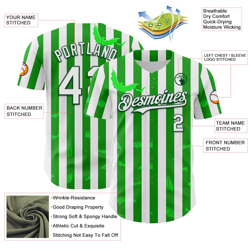 Custom White Green 3D Halloween Spooky Bat Stripe Authentic Baseball Jersey
