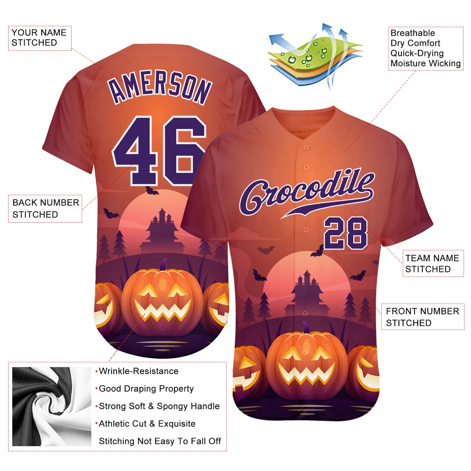 Custom 3D Pattern Halloween Pumpkins Skulls Candies Spiders Authentic Baseball Jersey