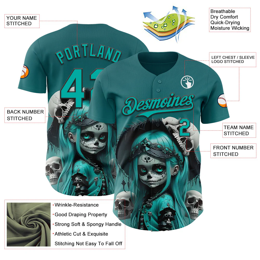 Custom Blue Aqua-Black 3D Halloween Spooky Skull Authentic Baseball Jersey